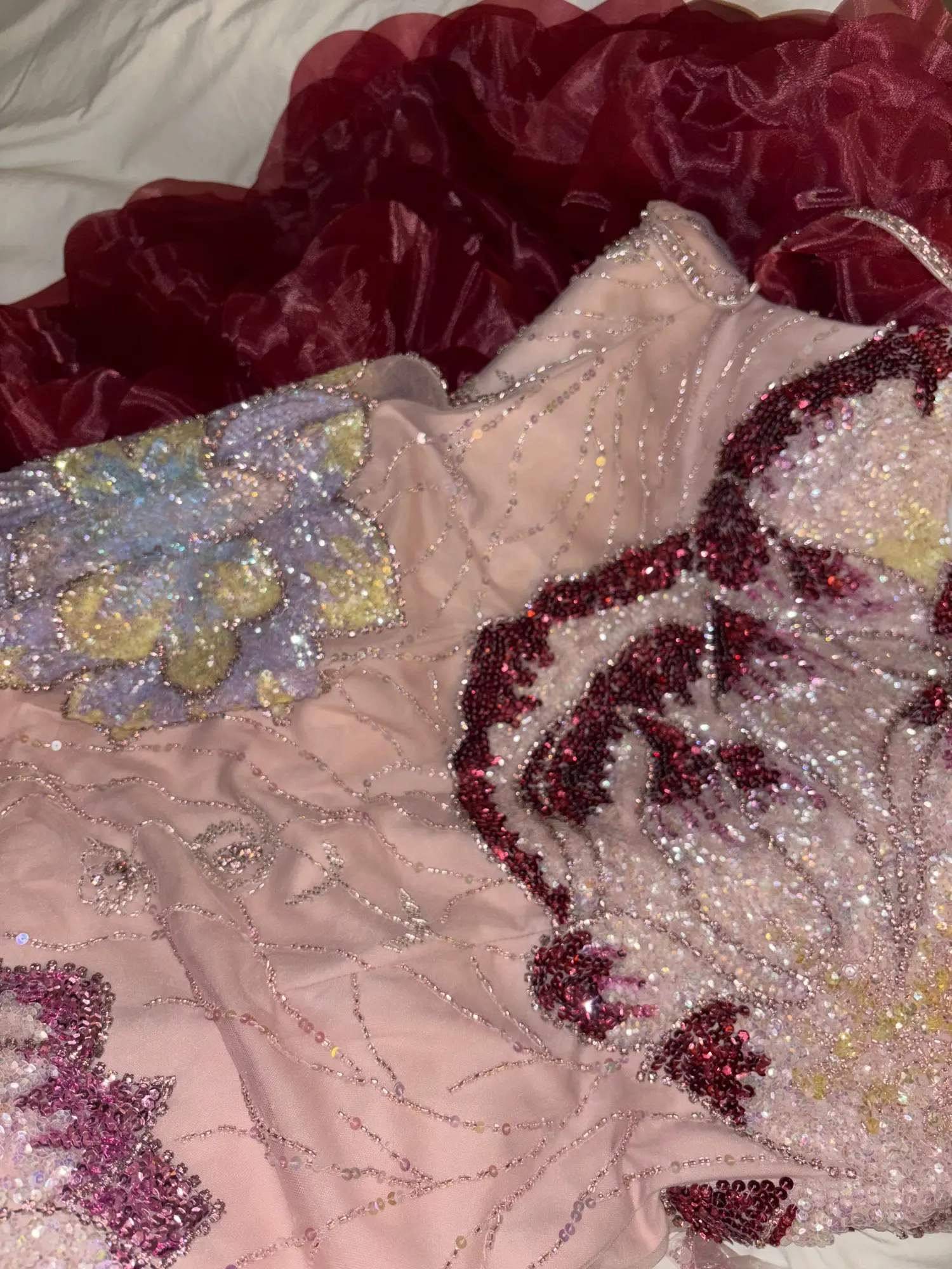 Step into elegant sophistication with our Luxury Pink Floral Beaded Evening Dress, beautifully designed with intricate handcrafted details and a rich, contrasting burgundy shawl cape. This exquisite gown features soft floral appliqués, delicate beadwork, and a graceful silhouette that creates a romantic and refined look perfect for high-end celebrations. The added shawl cape enhances the overall design with a dramatic, couture-inspired touch that moves beautifully with every step.