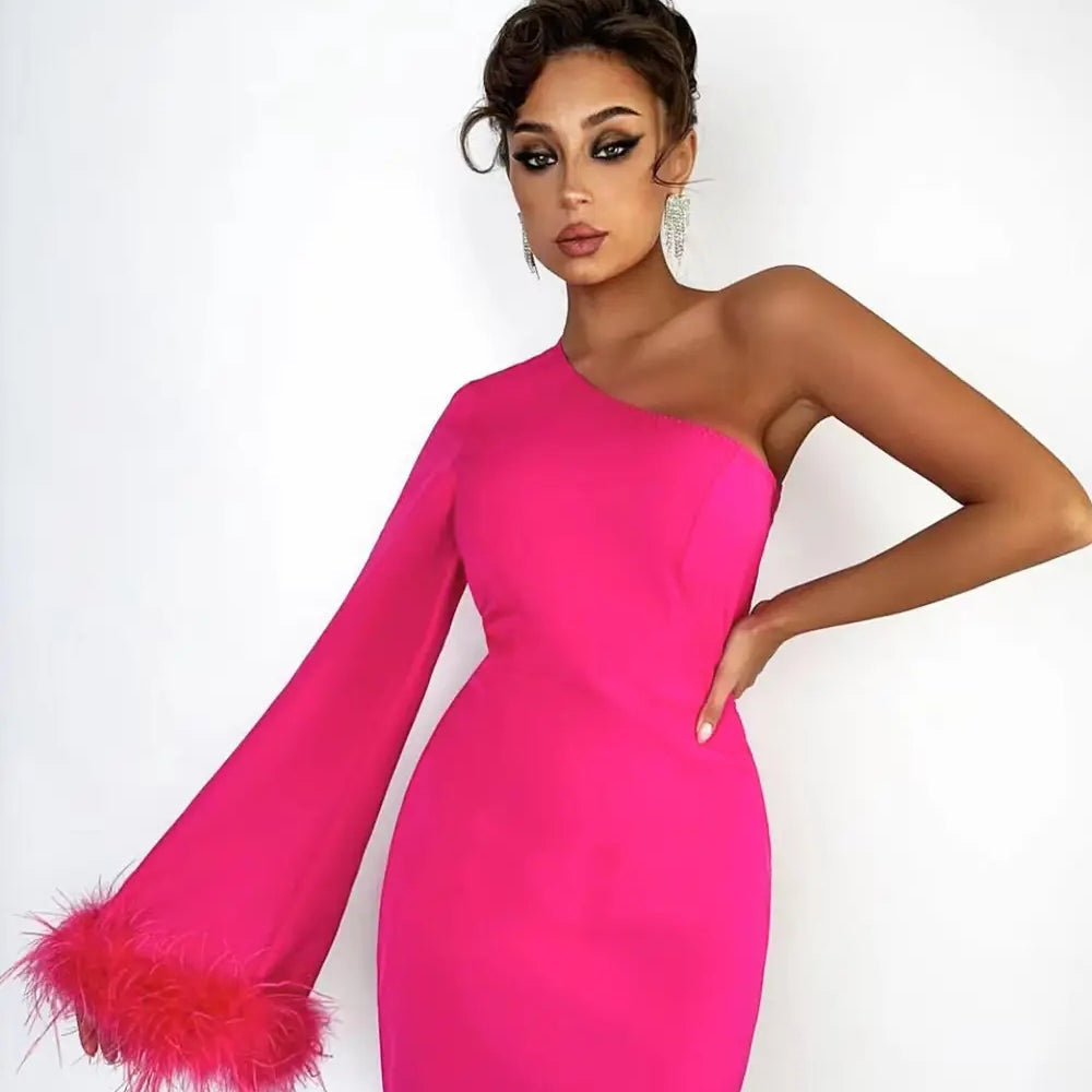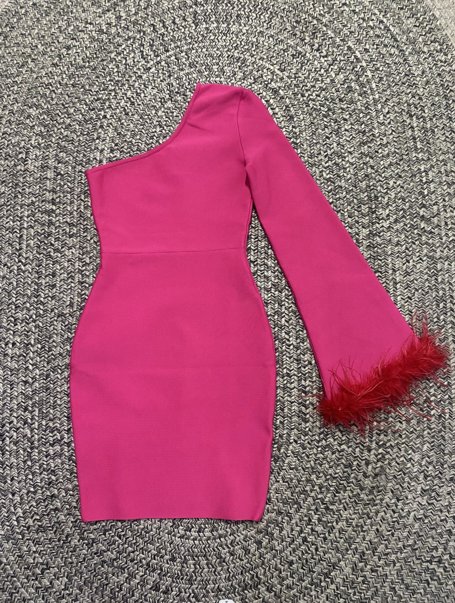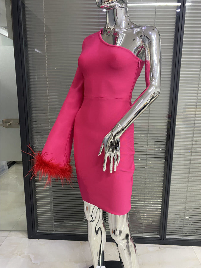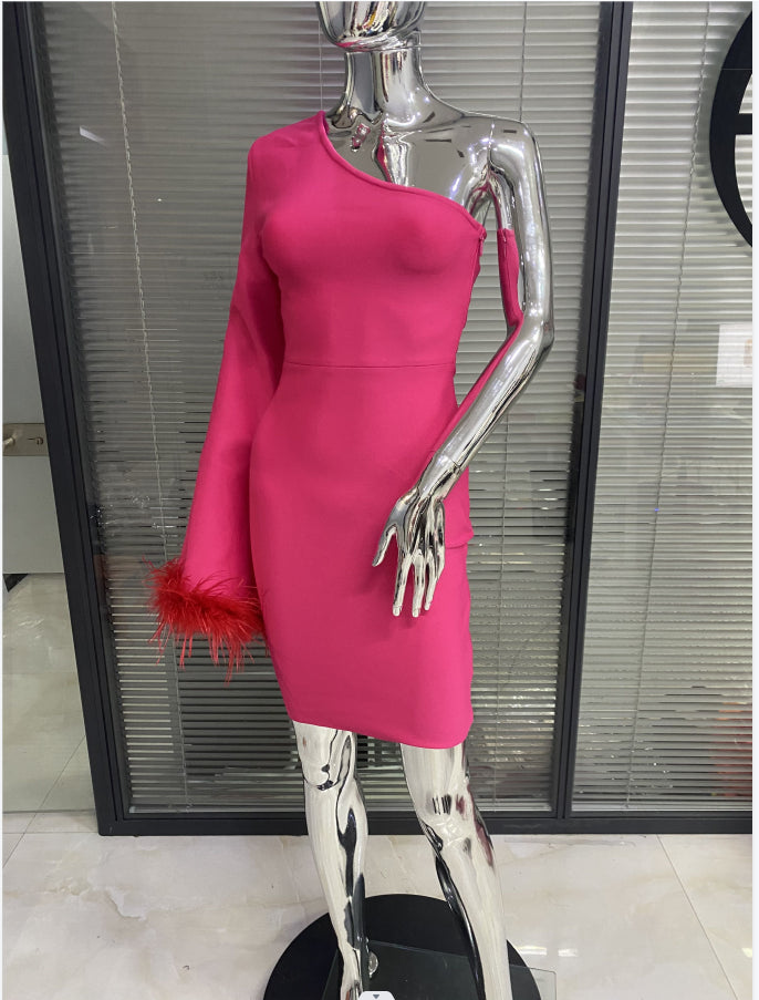 This One Shoulder Long Sleeve Celebrity Dress provides an ideal silhouette with its hot pink bodycon construction and feather detailing, perfect for a night club or evening party.