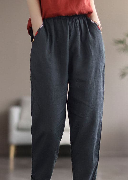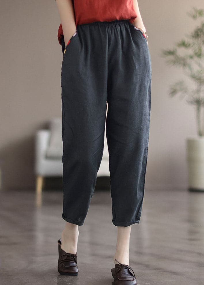 Plus Size Black Solid Pockets Linen Crop Pants Summer