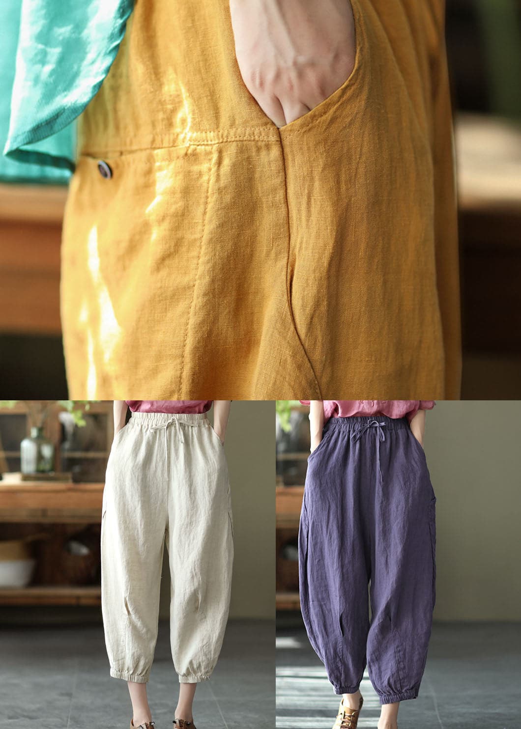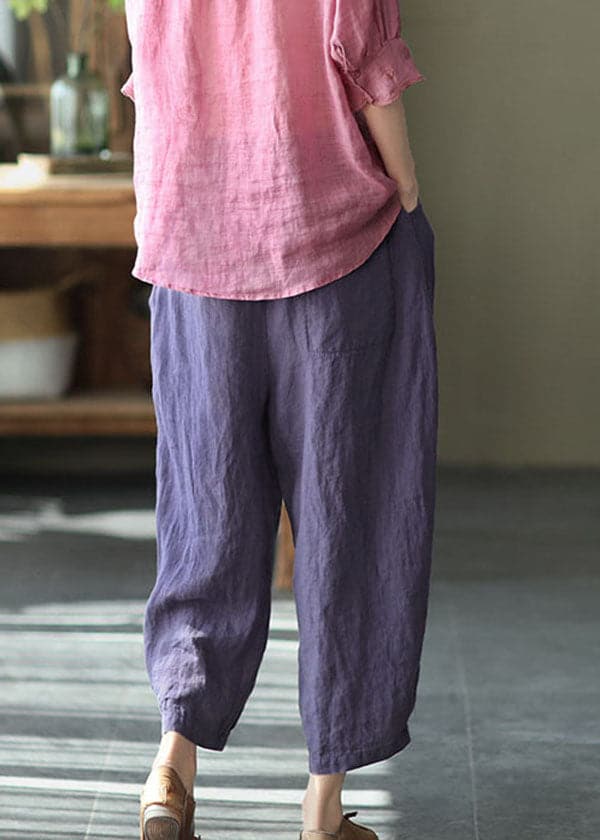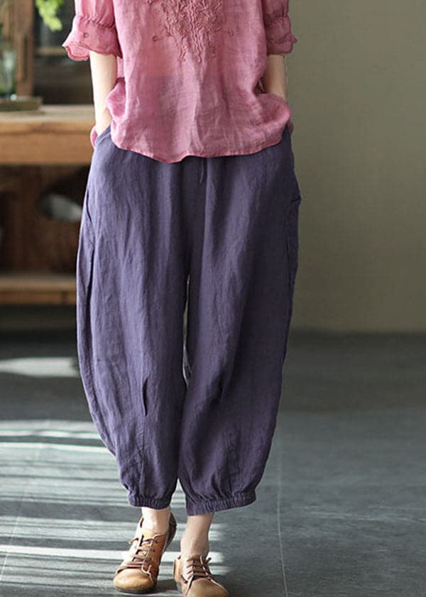 Purple Solid Linen Beam Pants Elastic Waist Wrinkled Summer