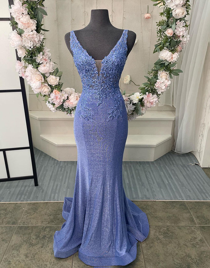 Purple V-Neck Corset Back Long Prom Dress With Appliques