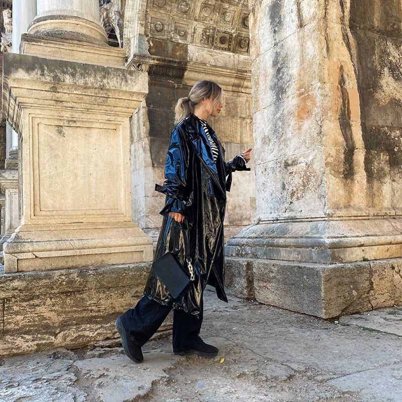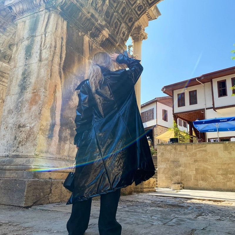 Step into the realm of dark elegance with our PVC Gothic Lapel Overcoat. This trench coat exudes a high street style. perfect for fashion-forward individuals seeking to make a bold statement.