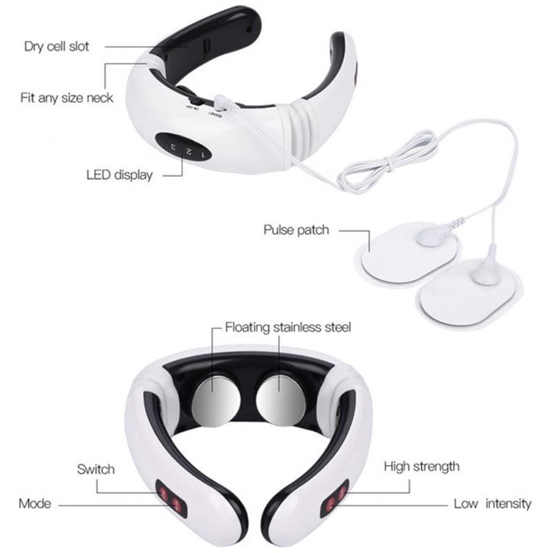 It features three-synchronous treatments: Low-frequency electrical pulse, Magnetic Effect, and Loop traction that perform different massaging modes to relieve knots and sore muscles.