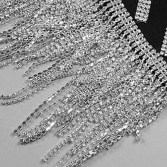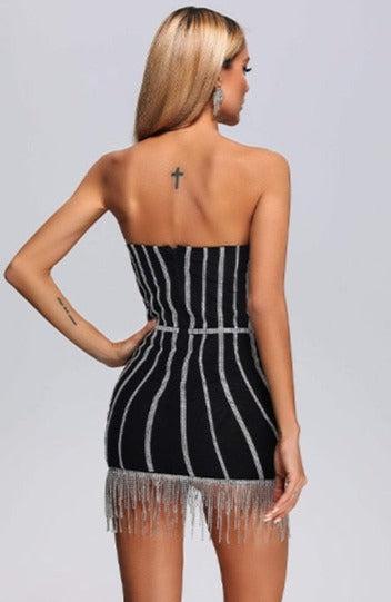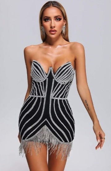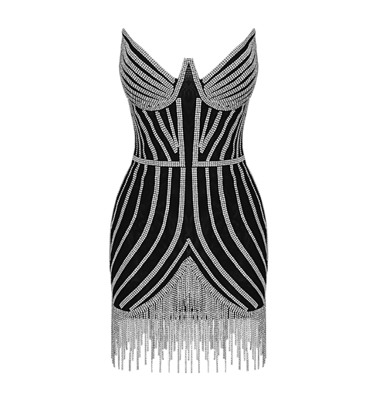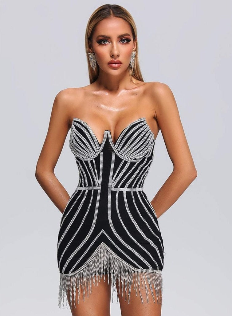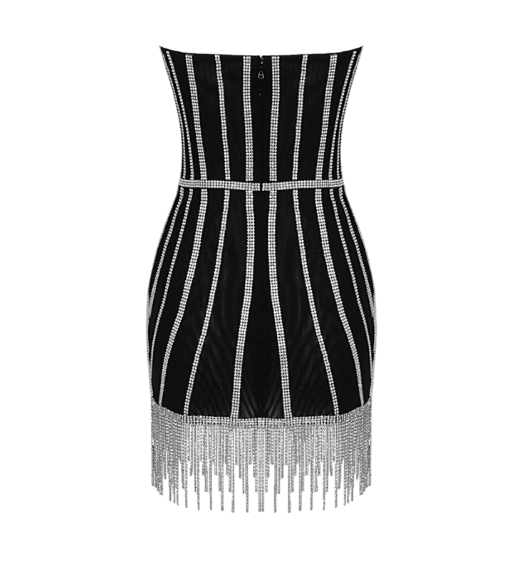 This Rhinestone Black Mini Dress is a definite showstopper! Featuring embellished corset bodice and tassel fringe detailing across hemline. Best served with a Cosmo and a pair of heels.