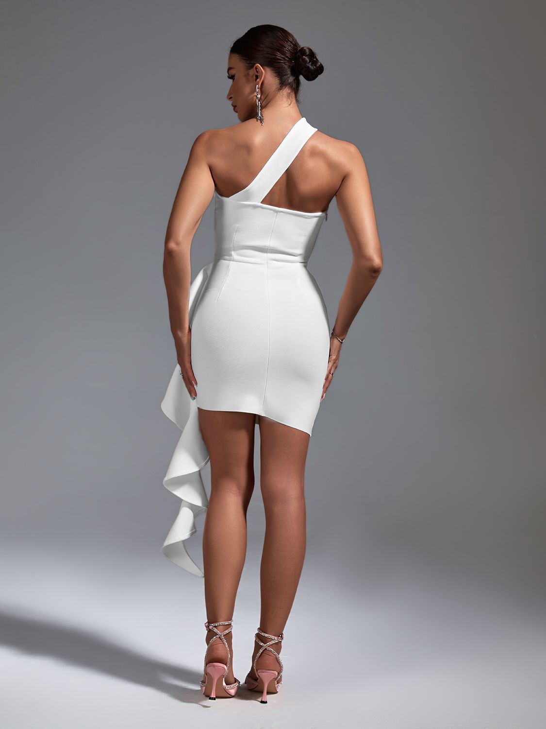 Introducing our stunning Ruffle White Bandage Mini Dress, a perfect blend of elegance and allure! This neck-mounted, one-shoulder style dress is designed to make you stand out at any club, party, wedding, red carpet event, or gala.