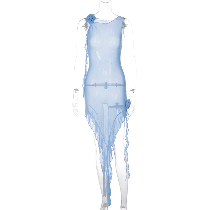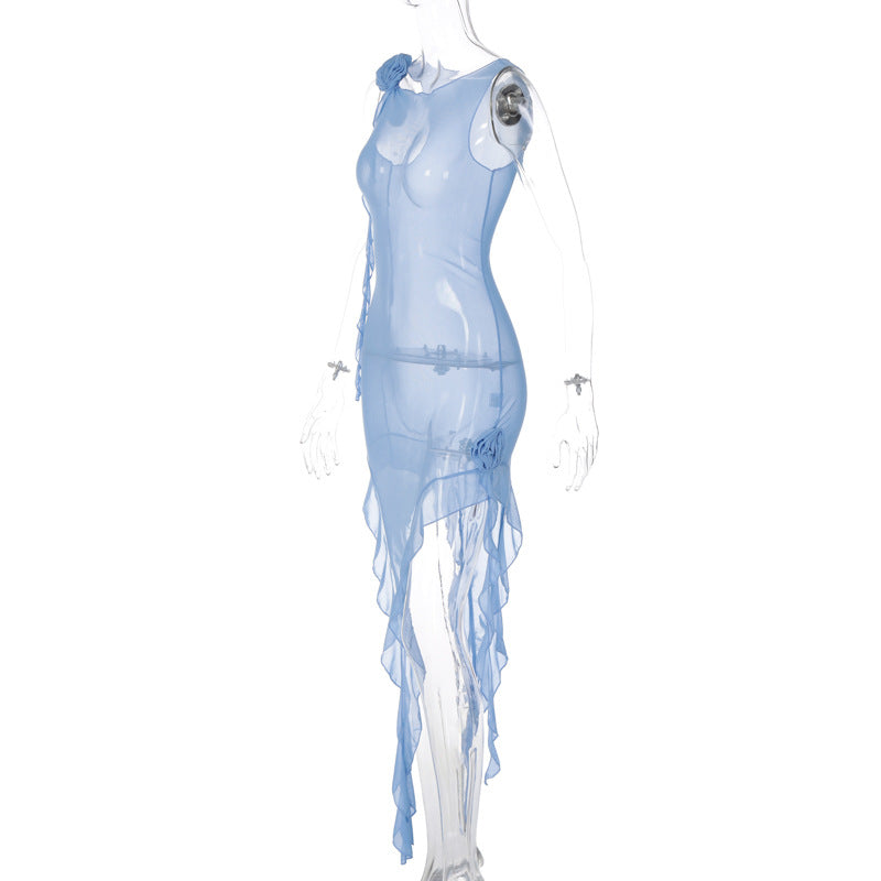 Ruffles Transparent Blue Dress is the most spectacular outfit for a summer vacation. Stretch. Decorated with a flower on the shoulder and on the hip. Long ruffles. Complete the look with stiletto heels and a handbag for an exquisite look.