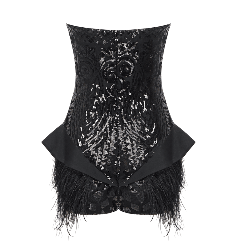 Got plans for the weekend? Then this sequin embellished Sequin Bodysuit with Feathers is sure to be the answer to all your styling dilemmas. Featuring a scoop neckline bustier and feather hem detailing. Team with high heels, luxe accessories and a mini bag for a vibe that is sure to make heads turn.