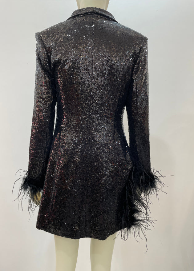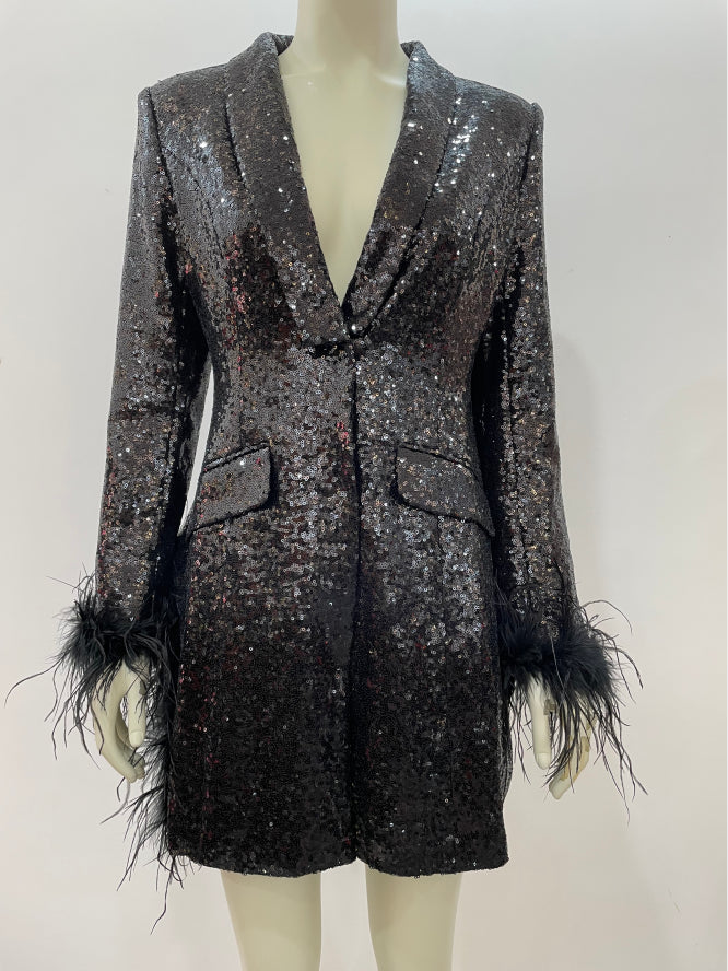 Get ready to turn heads in our stunning Sequin Feather Blazer Dress. Perfect for a night out on the town. this dress is sure to make you feel confident. stylish. and comfortable all at the same time.