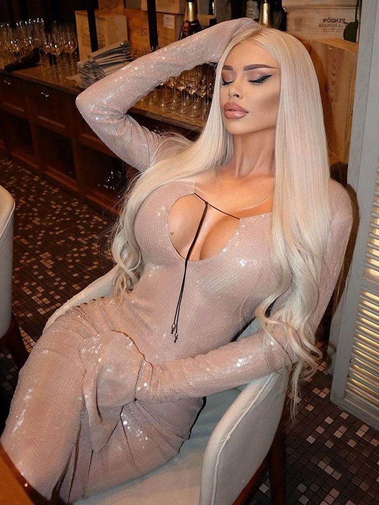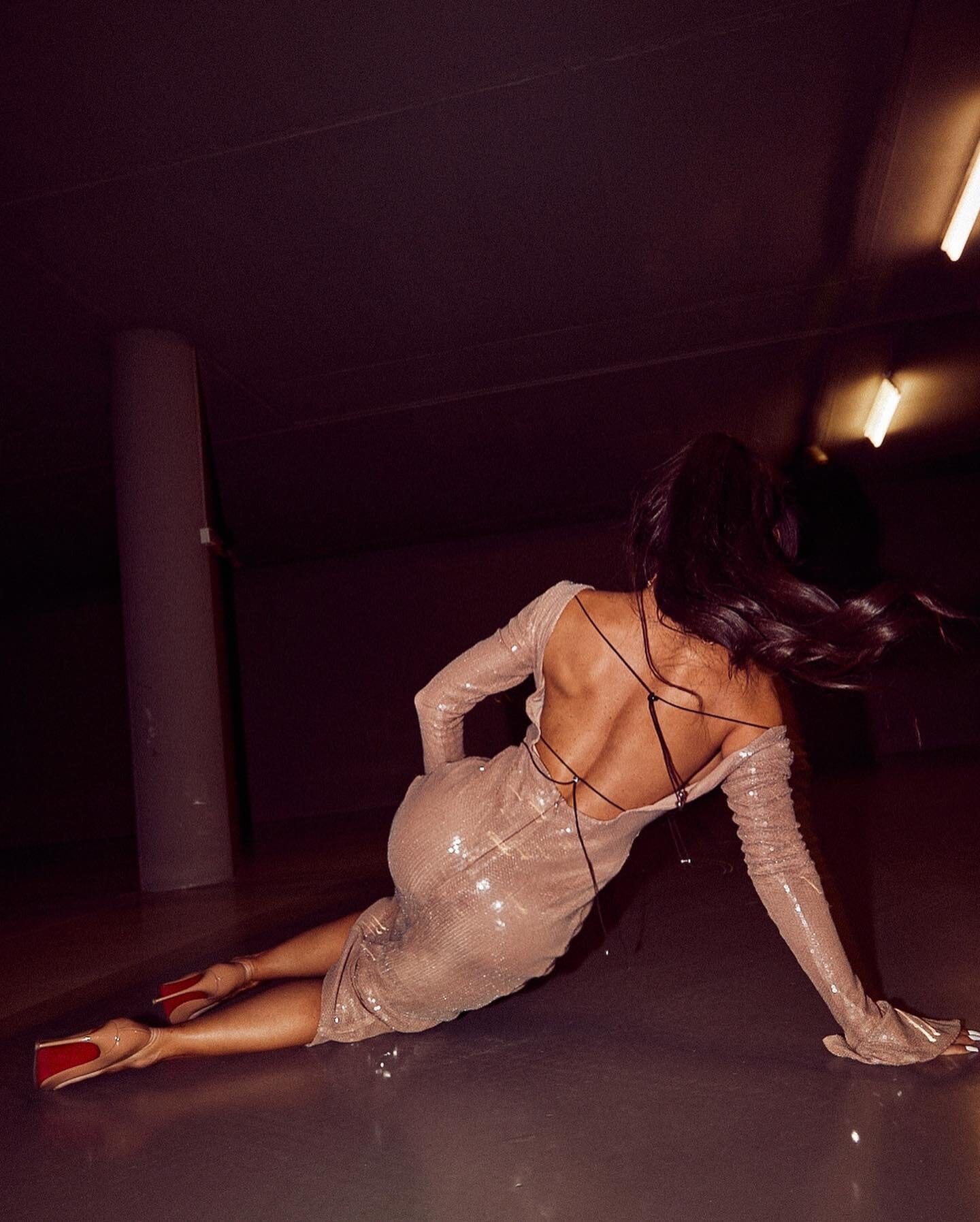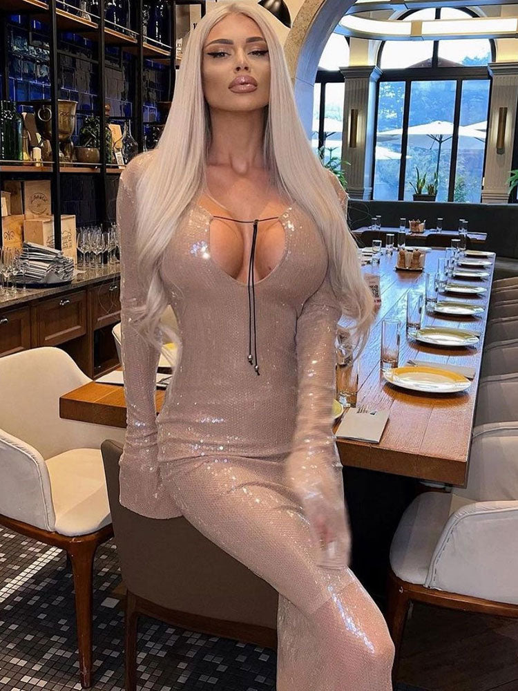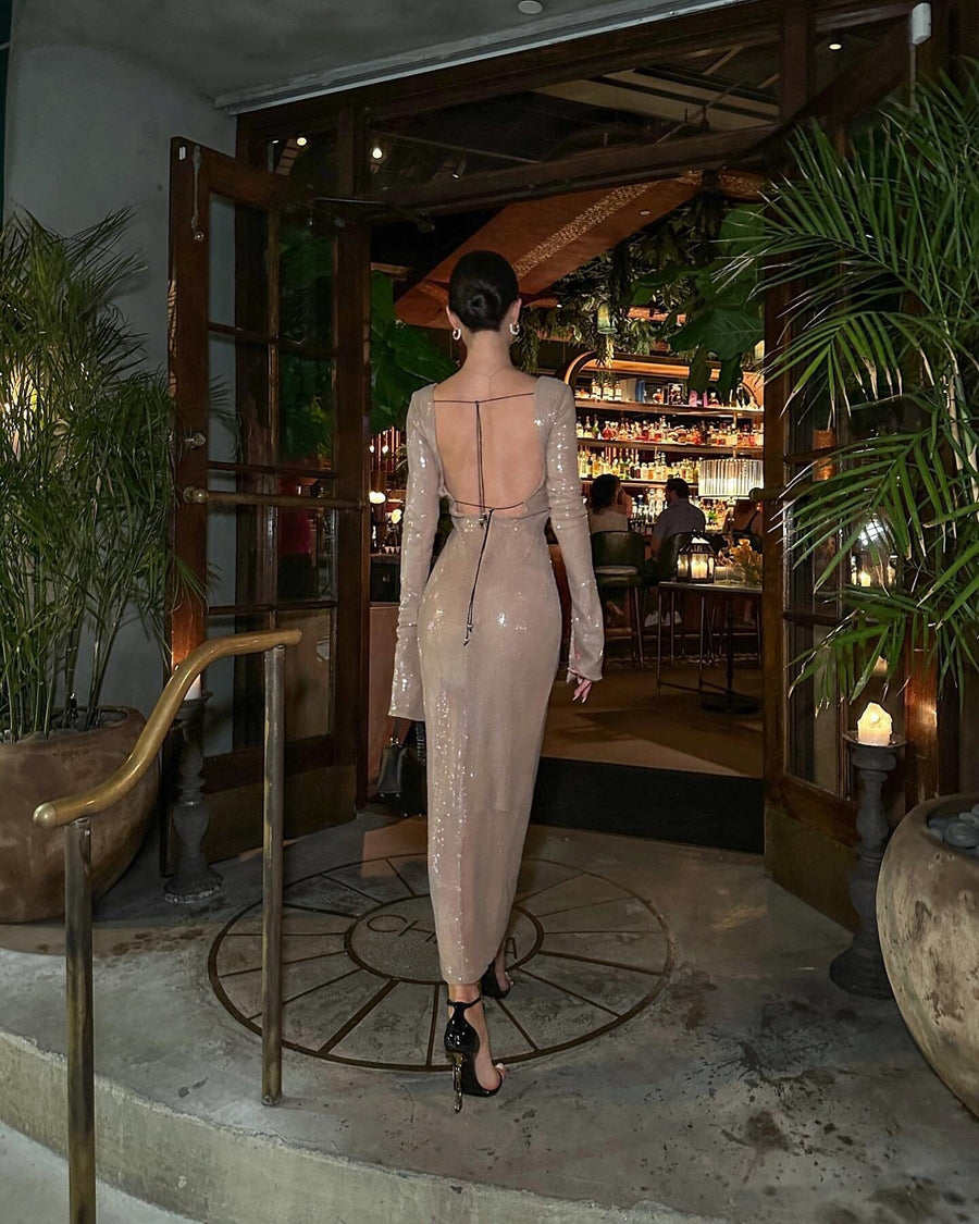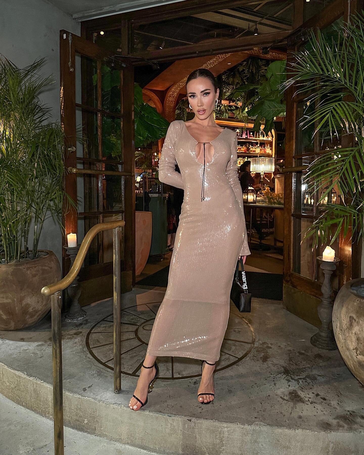 Turn up the heat with Sequined Beige Maxi Dress with Open Back. Featuring a sequin material with a plunge neck, a split cuff detail and a flattering fit, we are in love. Team with heels and accessories for a look that will get everyone talking.