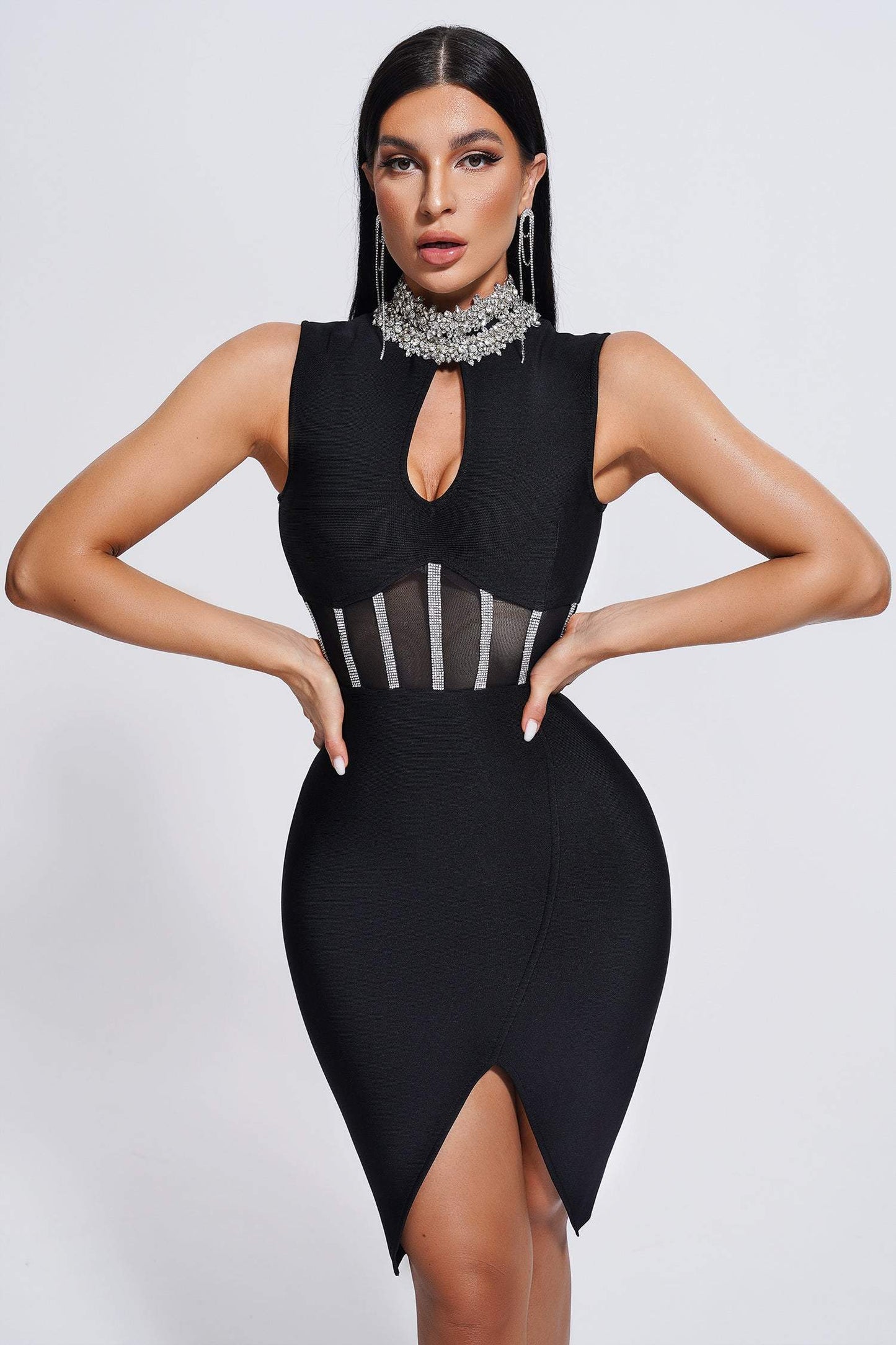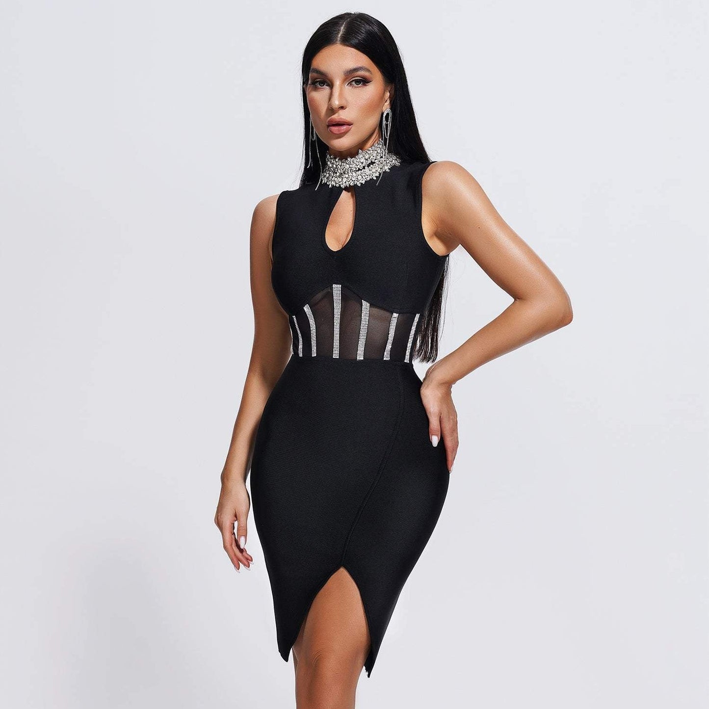 The knee-length design and natural waistline create a flattering silhouette that is perfect for any occasion, whether you're headed to a prom, party, or club. The high-neckline adds an extra touch of elegance, while the cut-out silhouette and crystal detailing add a bold and daring edge.