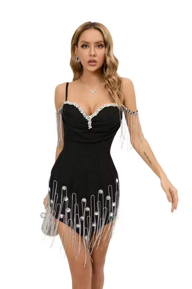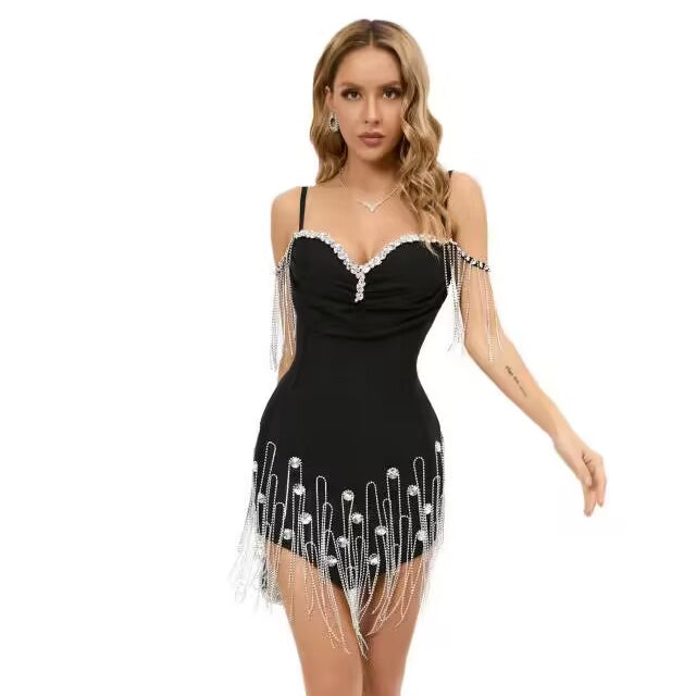 Adorned with exquisite crystal and tassel details, this dress sparkles and shimmers as you move, creating a mesmerizing effect. The sleeveless design enhances the dress's allure, giving you freedom of movement while keeping you cool.