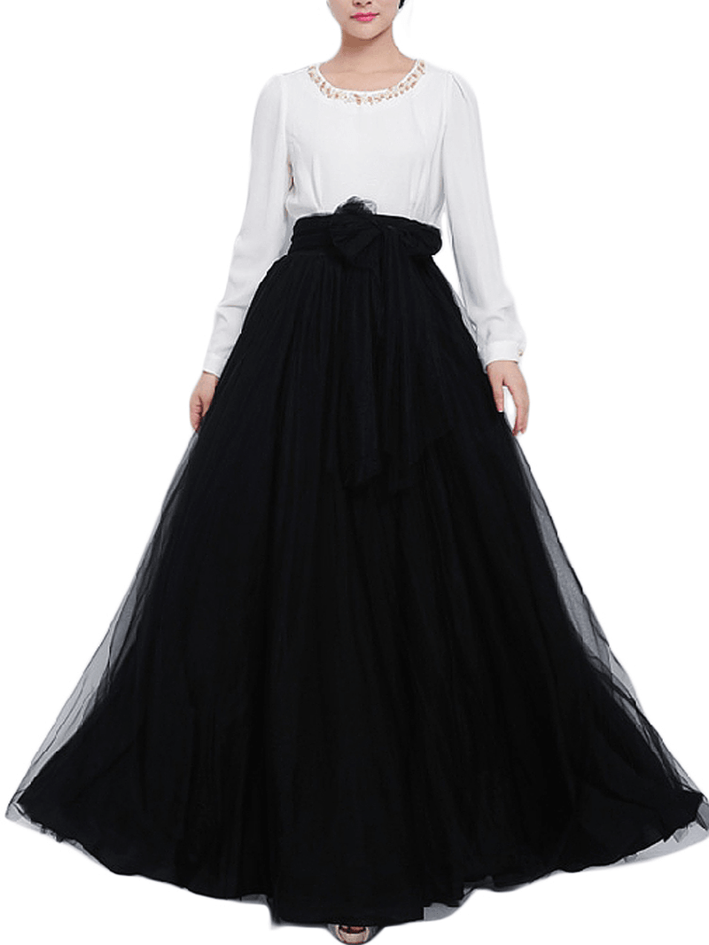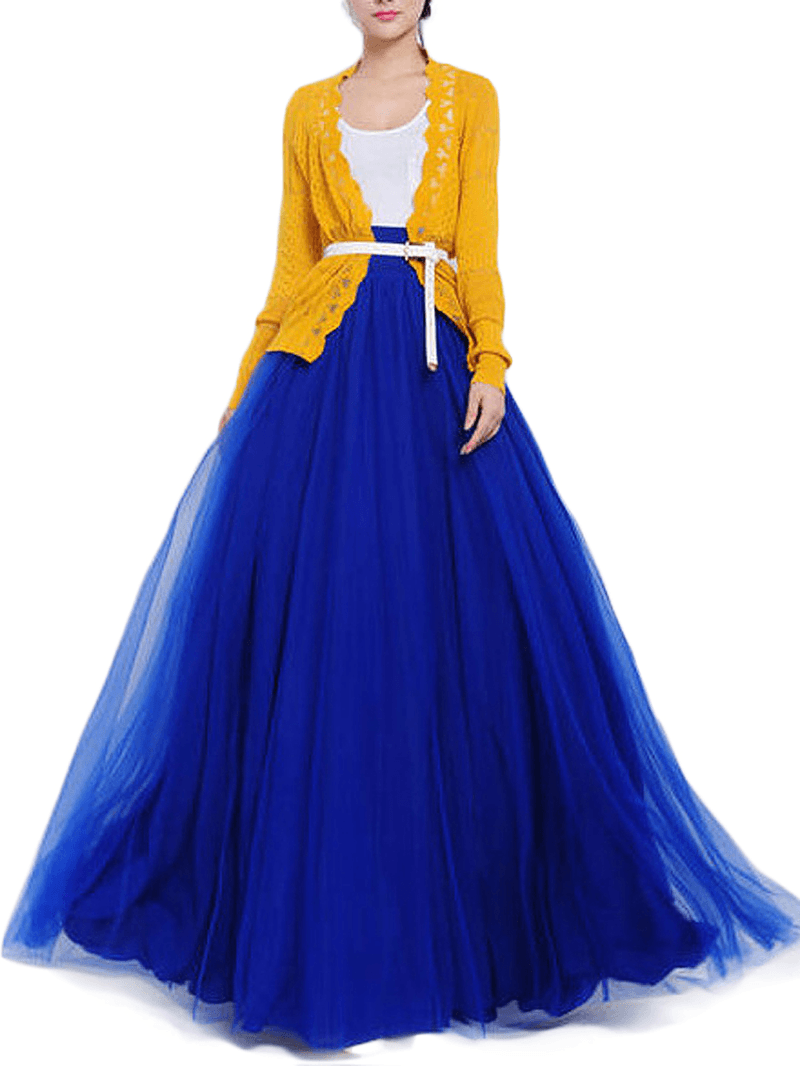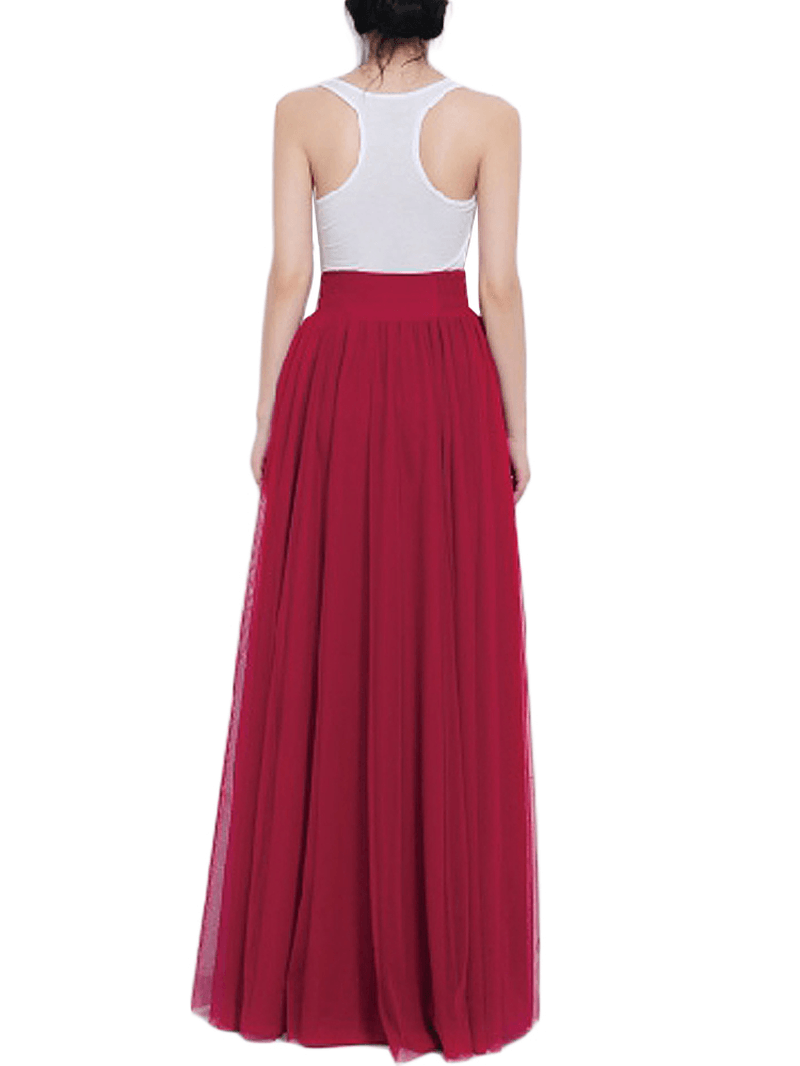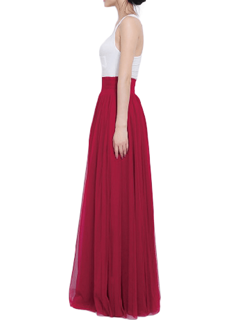 Solid Color Mesh Tulle Pleated Maxi Skirt