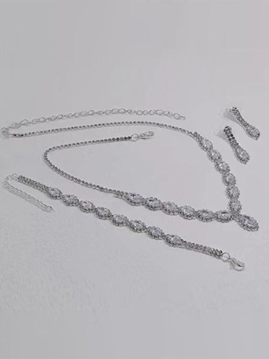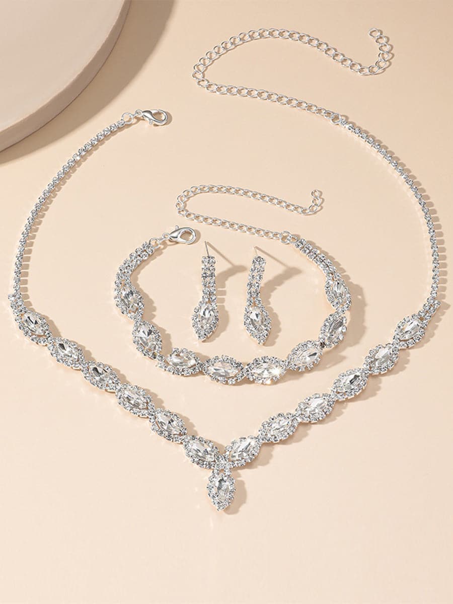 This stunning Sparkling Rhinestone Necklace Earrings Bracelet Set will add a glamorous touch to any ensemble with its sparkling rhinestones and silver-tone accents. An ideal gift for special occasions.