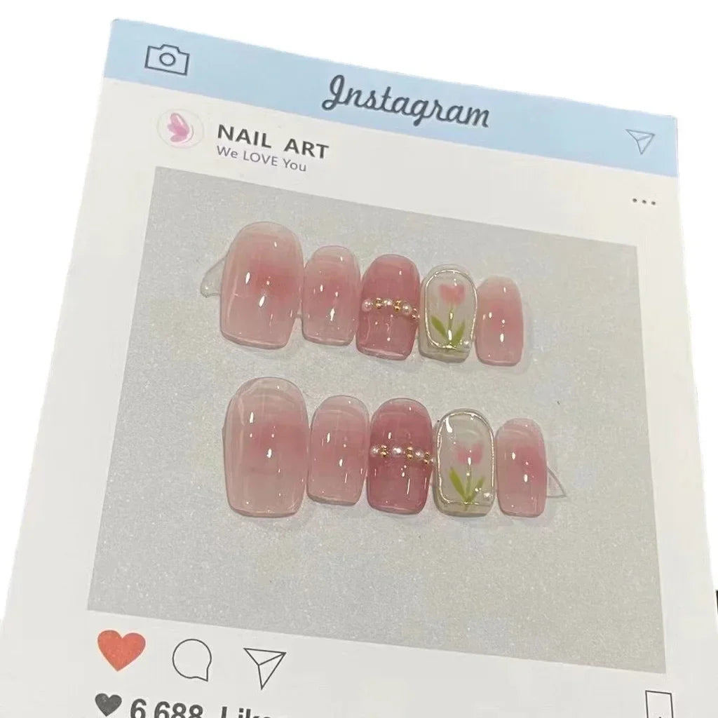 Spring Girl Blush Manicure Pearl Tulip Square Fake Nails Pink Sweet Handmade Nail Art Patches Girl Gift