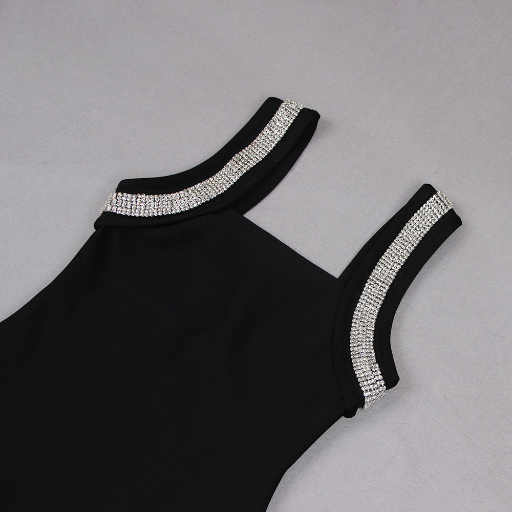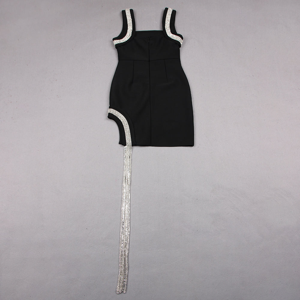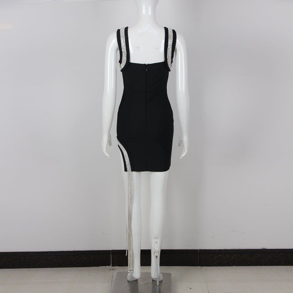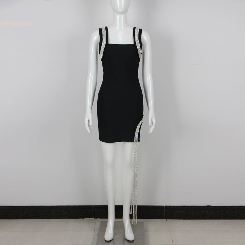 This stylish black mini dress is perfect for any occasion. The square neckline and sleeveless design are flattering and feminine, while the crystal and tassel embellishments add a touch of glamour. The bandage fabric hugs your curves in all the right places, and the straight silhouette is flattering on all body types. This dress is made from sustainable materials, so you can feel good about wearing it. It is also anti-static, anti-wrinkle, breathable, and machine washable.