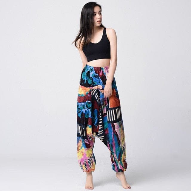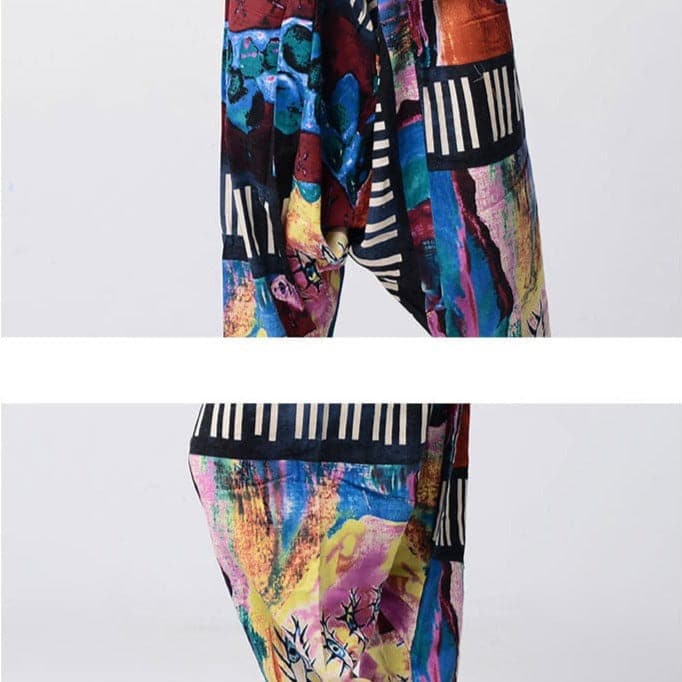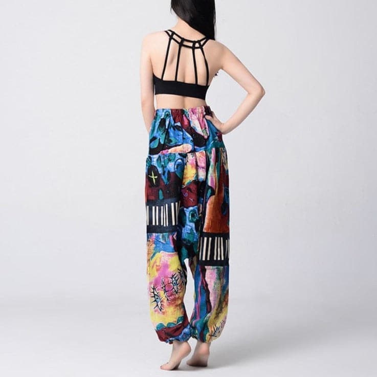 Be a walking art piece in our Artist's Way Harem Pants. The complex and artful design brings to life the intricately crafted abstract design. The brightly colored print is transcendental and lively which creates a bold look. These pants are sure to breathe life into the mundane day-to-day outfit. Pair them with a solid print top that's color mimics the colorful pattern and some shoes that are simple and clean-cut to style.