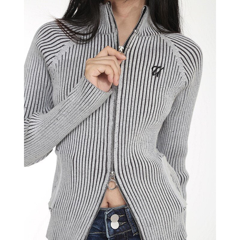 Vintage Double Zip Street Long Knitted Cardigan Women Coat Spring Cool Girl Autumn Slim Sweaters Y2k Aesthetic Jackets 2023