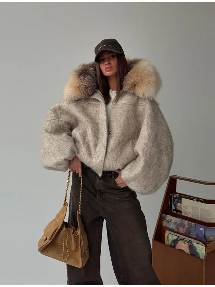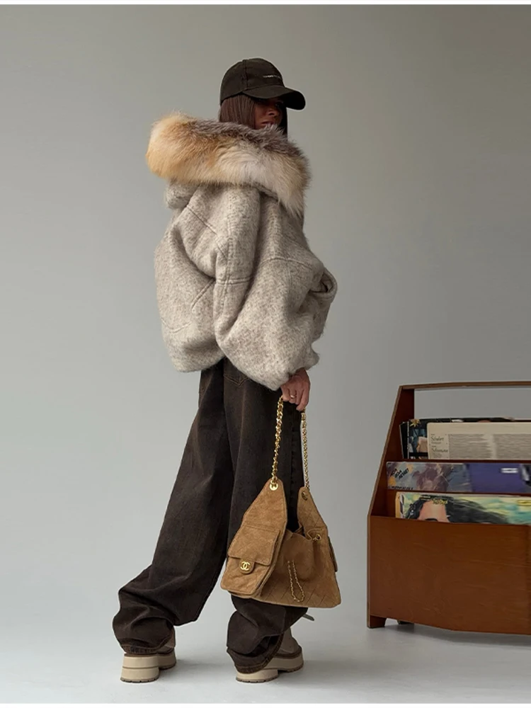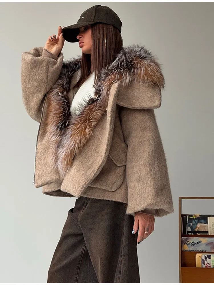 Vintage Thicken Faux Fur Woolen Hooded Pocket Lantern Sleeve Elastic Waist Coat Women