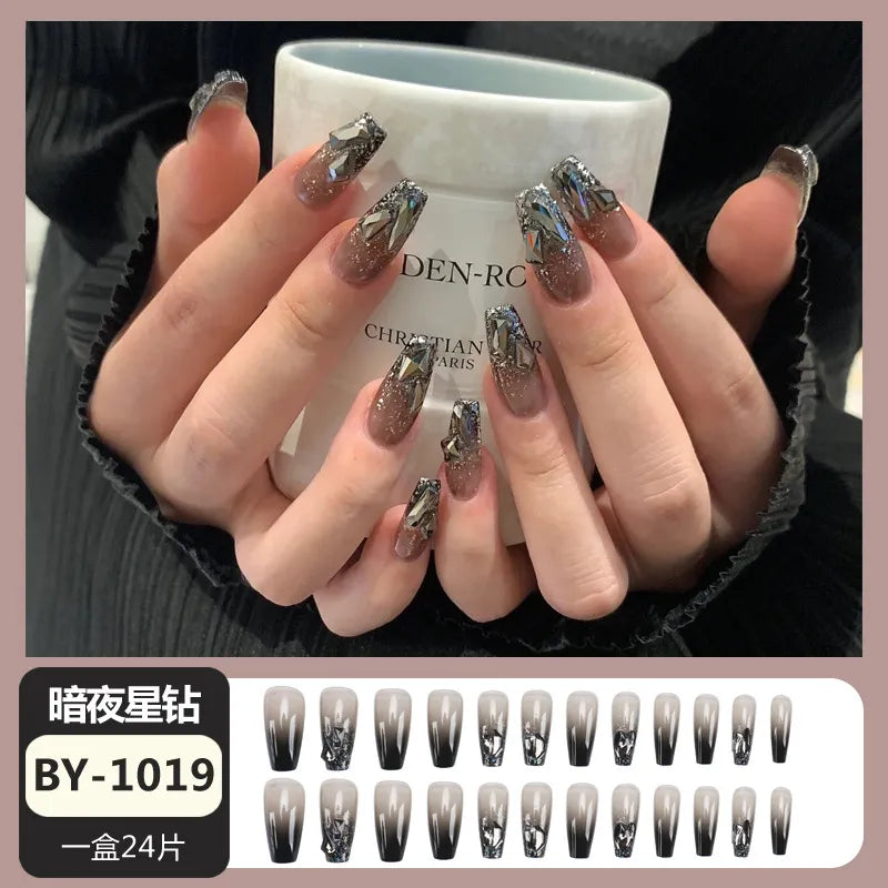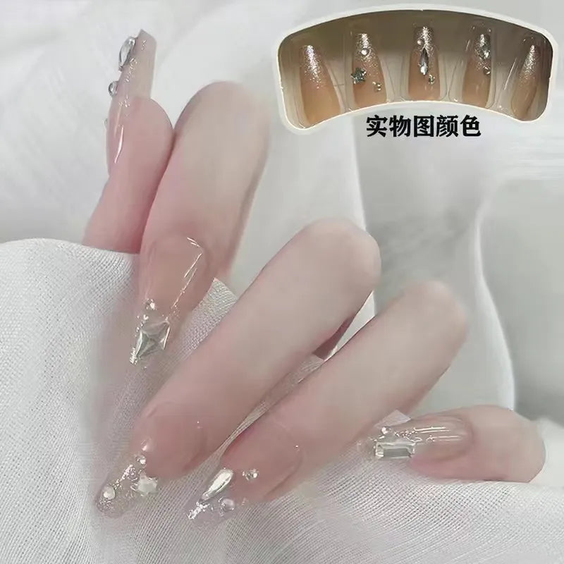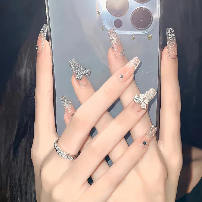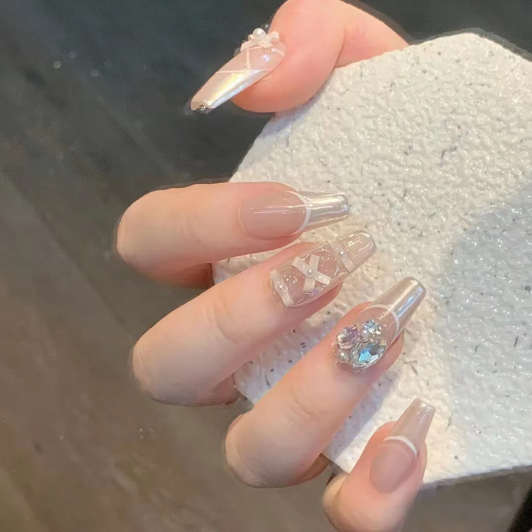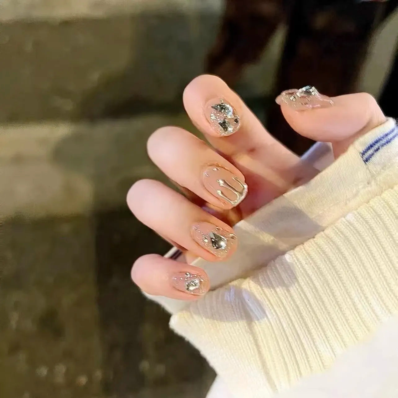 Wearable Silver Stripes Y2k False Nails Long Almond Round Fashion Nail Tips Press On With Silver Beads Designs Fake Nails Art