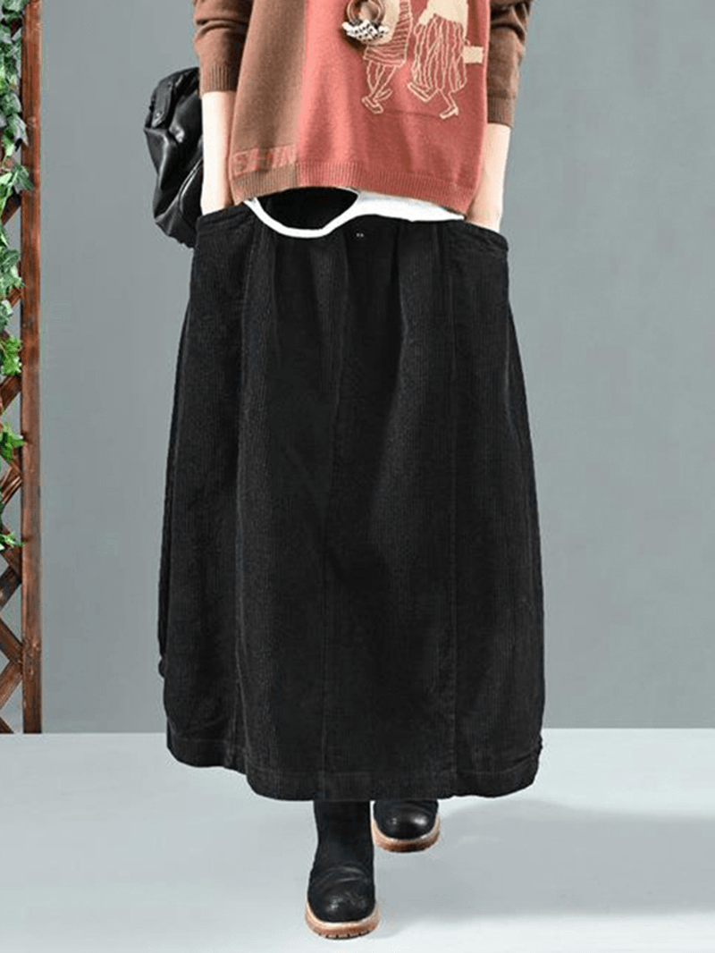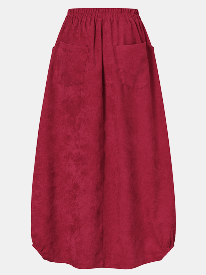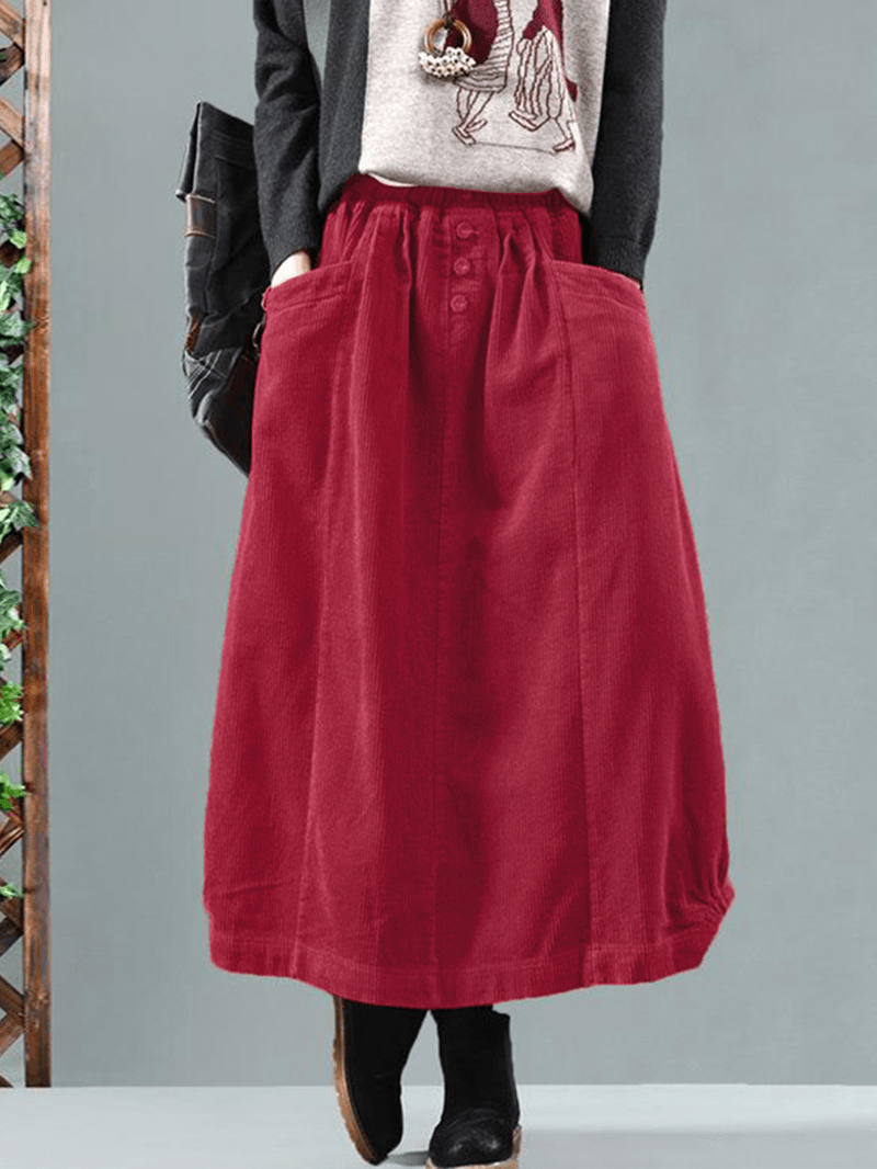 Women Corduroy Button Trim Elastic Waist Solid Retro Skirt with Pocket