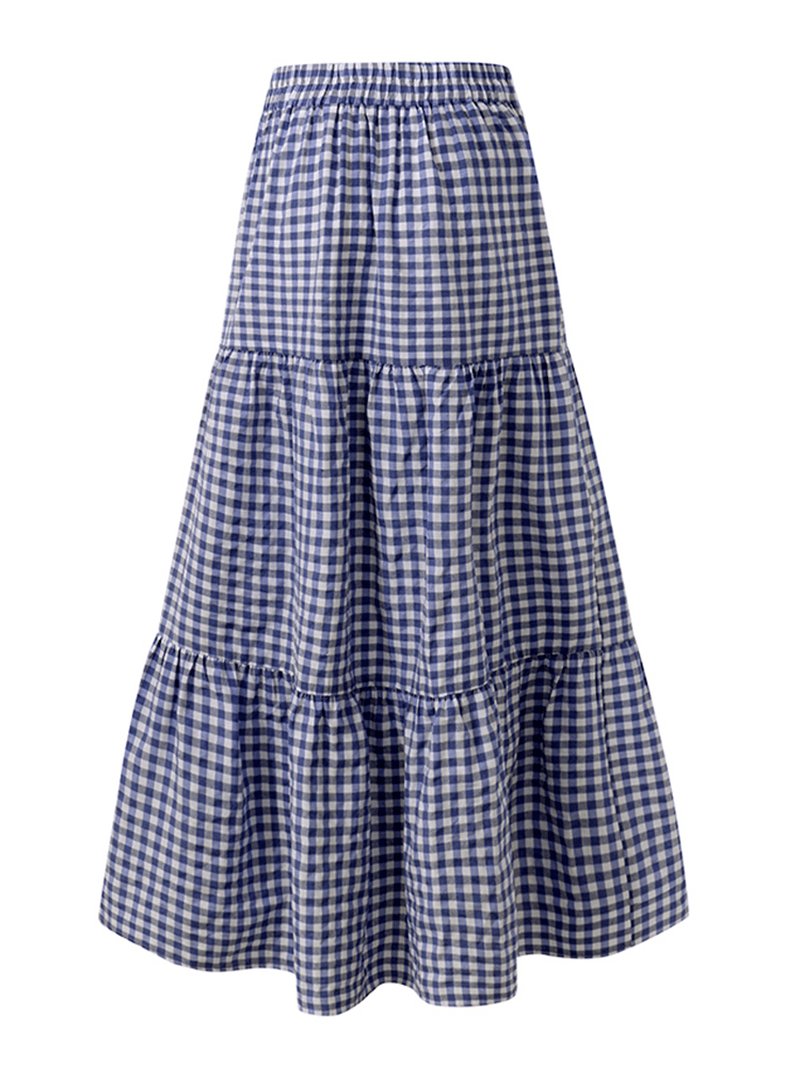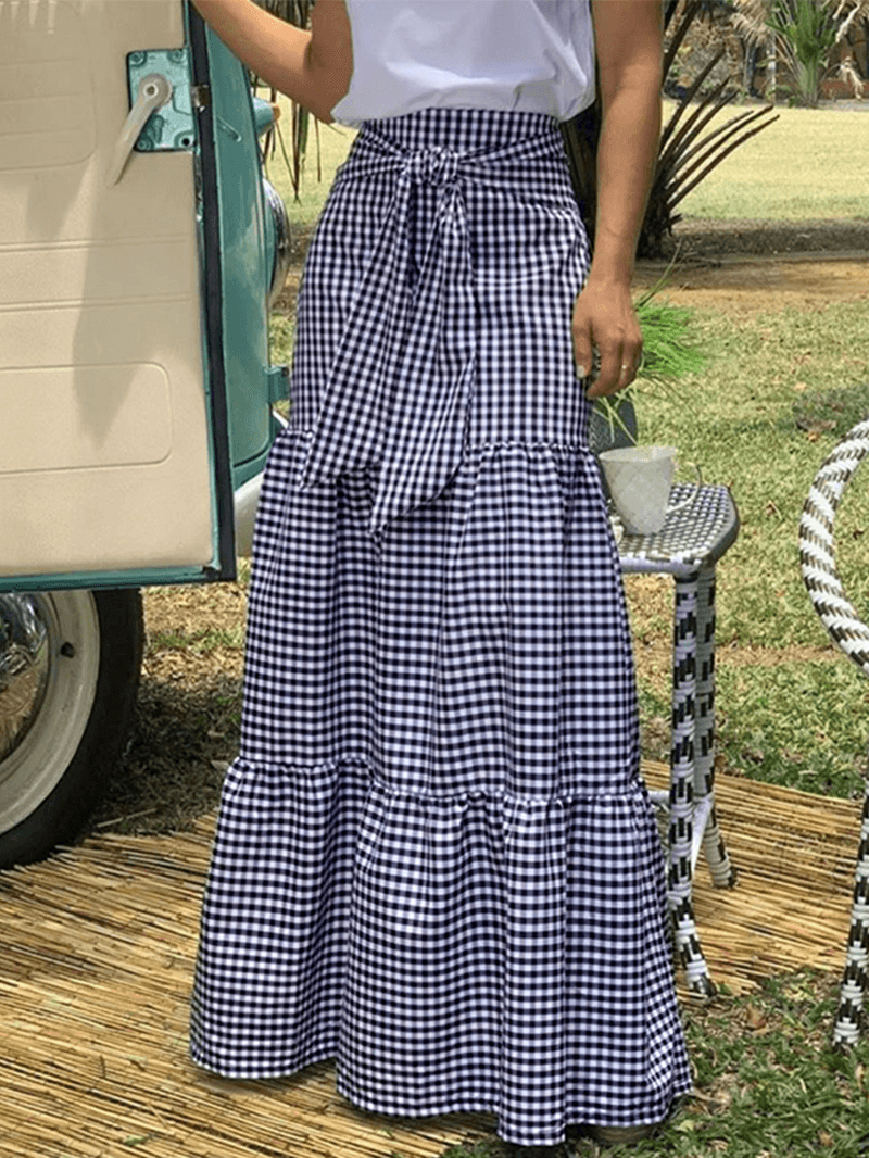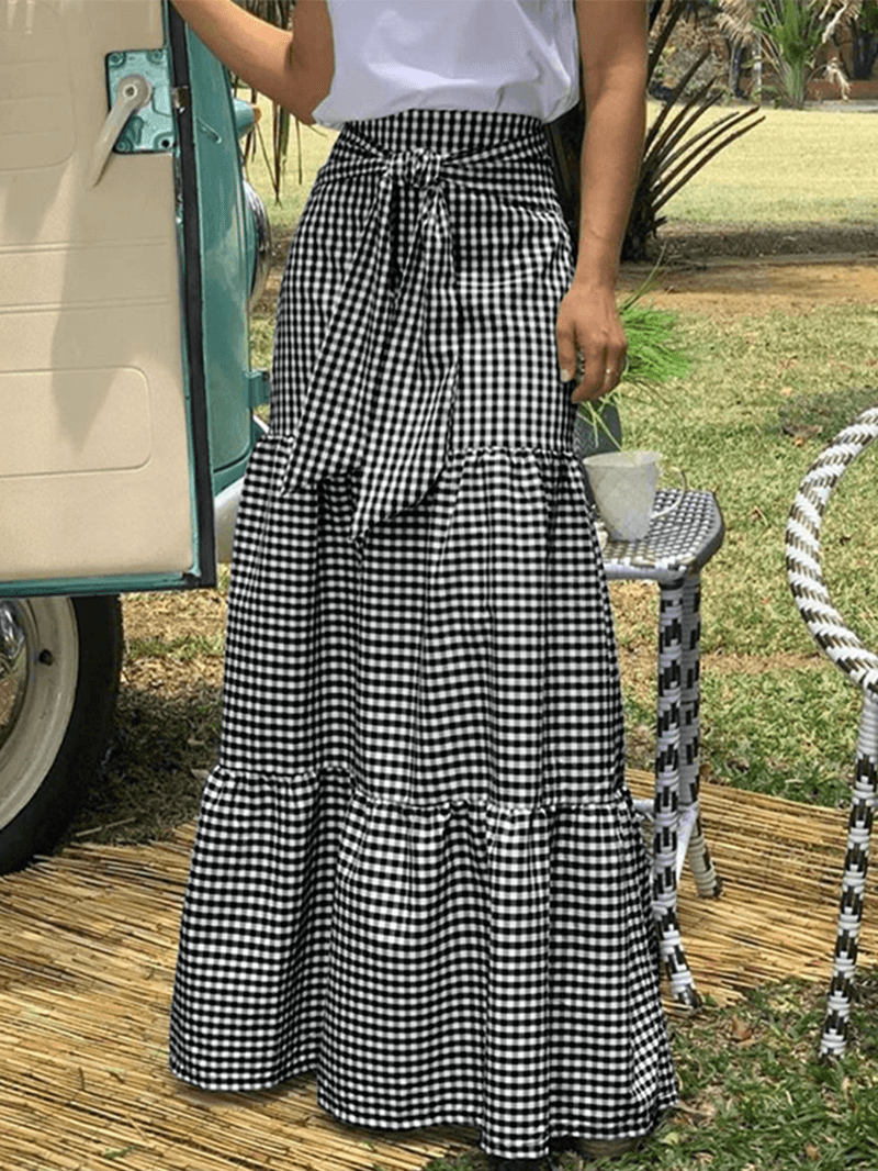 Women Plaid Pleated Lace-Up Elastic Waist Swing Skirts