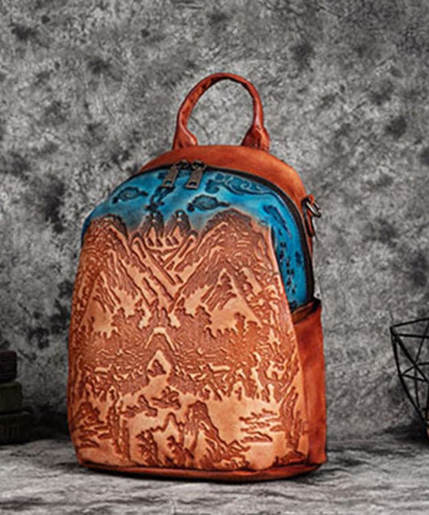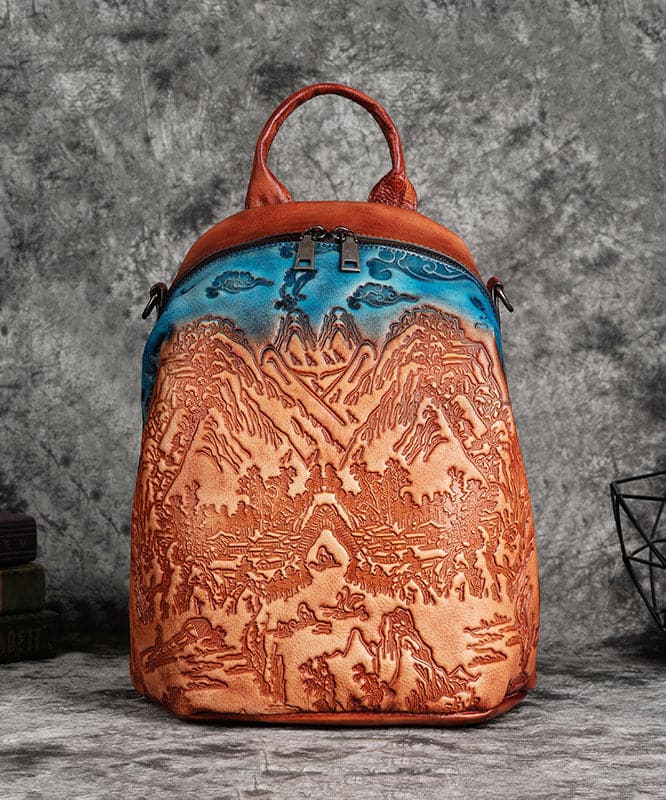 Women Red Brown Embossing Paitings Calf Leather Backpack Bag